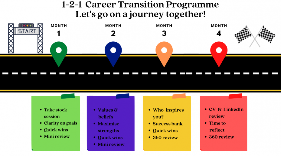 This enables us to discuss the reasons you are thinking of coming to a career transition coach, whether it could be helpful for you and whether I am the right coach to help you. After our introductory call, there will be no obligation for you to continue if you feel that career transition coaching isn’t for you or if you’re unsure that I'm the right fit for your needs.
